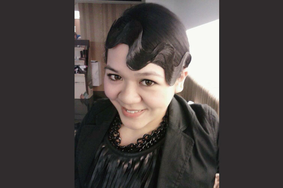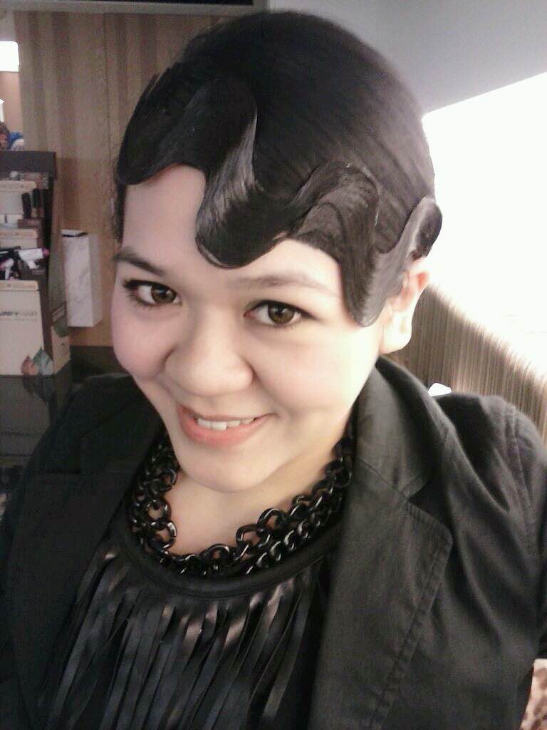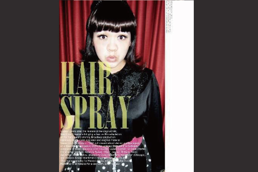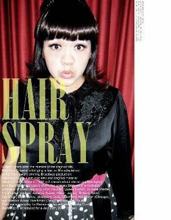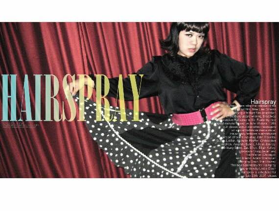 穿上媽媽的黑色緞面蕾絲襯衫,搭我在二手店挖到的黑底白點點長裙,配上桃紅寬腰封,突然覺得自己滿有電影《髮膠明星夢》的味道,不如就玩到底吧!立刻戴上假瀏海片,並且把髮尾吹外翹。桃紅寬腰封除了有高腰拉長腿部視覺效果的功效之外,還能在這一身黑鴉鴉的裝扮中達到畫龍點睛的作用。